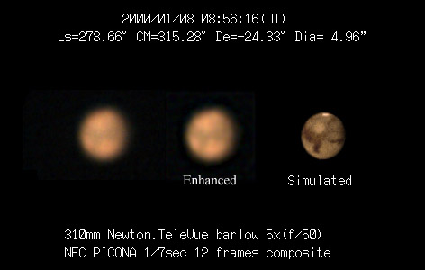 2000/01/08 08:56:16(UT) Ls=278.66 CM=315.28 De=-24.33 Dia= 4.96" 310mm Newtonian(F5) TeleVue barlow 5x f/50 3 deg. prism PICONA 1/7sec,12 frames composite (強調画像:作成伊賀)