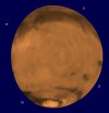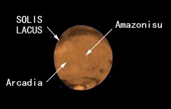 Ls=75°に当たります。経度では大陸Amazonisu(アマゾニス)が中央に占める最も観測のやりにくい経度です。たまたま観測を始められる日がこの日だったので,最も厳しい観測のスタートとなりました。北極冠はしっかり確認できました。目だった点はSOLIS LACUS(ソリス湖)付近に雲でもあるのか明るくなっていたことと,大陸Amazonisu(アマゾニス)の東のはしの大陸のArcadia(アルカディア)付近が暗くなっていました。この部分は毎回同じように暗くなりますが,今回はやや淡くなっているのではないかと思います。(文責安達)