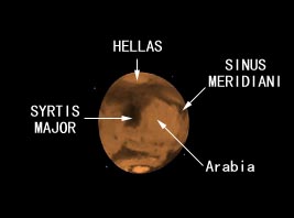 今年はArabia(アラビア)の中央付近が例年よりも濃く感じられます。画像の強調処理の影響が出ているのかもしれませんが,全体的に見て例年よりも濃くなっているのではないかと思われます。まだ,視直径が小さく,断定はできませんが,この画像を見ると,ますます。その様な感じを強く受けます。HELLAS(ヘラス)が白くなっているのは明らかにこの盆地に発生した霧です。火星の霧はこの様に非常に白く見られます。視直径が大きくなると,乳白色の霧の下に本来の模様の見えることもよく起こります。どの場所がいつごろ霧に覆われるか注意して記録したいものです。(文責安達) |