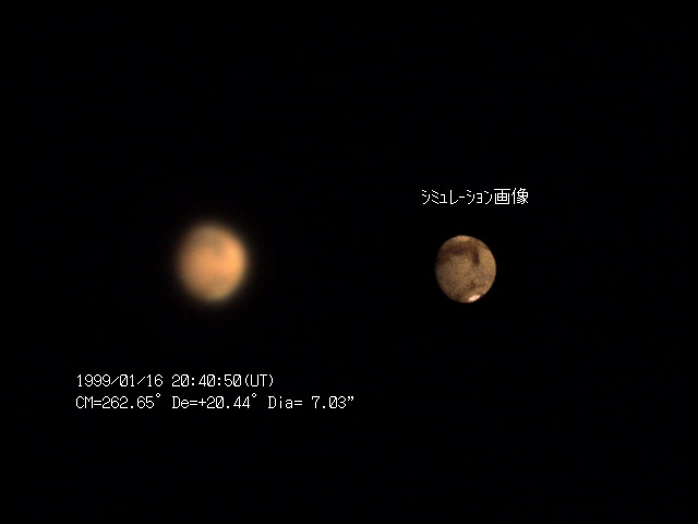 ![]() 1999/01/16 20:40:50(UT) CM=262.65゜De=+20.44゜Dia= 7.03" 31cm F5 ニュートン テレビュー5Xバーローレンズ 1゜プリズム 合成 F49 NEC PICONA 1/7秒 3枚コンポジット |