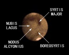 おなじみのSYRTIS MAJOR(シルチス)のよく見える位置の観測です。今回の観測で,SYRTISのすぐ北側にある,BOREOSYRTIS(ボレオシルチス)が濃くなっている様子が確認されました。ここ数回の接近ではいつも濃く見えていましたが,今回もその状態が継続されていました。反対に,そのすぐ東にあるNUBIS LACUS(ヌービス)とNODUS ALCYONIUS(アルキオニウス)あたりは,前回のとおり淡いままになっていることが確認できました。今回の画像では北極冠に雲が覆っておるらしい様子が捉えられています。白さが低く,全体的に見て黄色っぽくなっている様子がわかると思います。これから後,北極冠の輝度が落ちるかもしれませんから,観測には注意が必要です。(文責安達) |