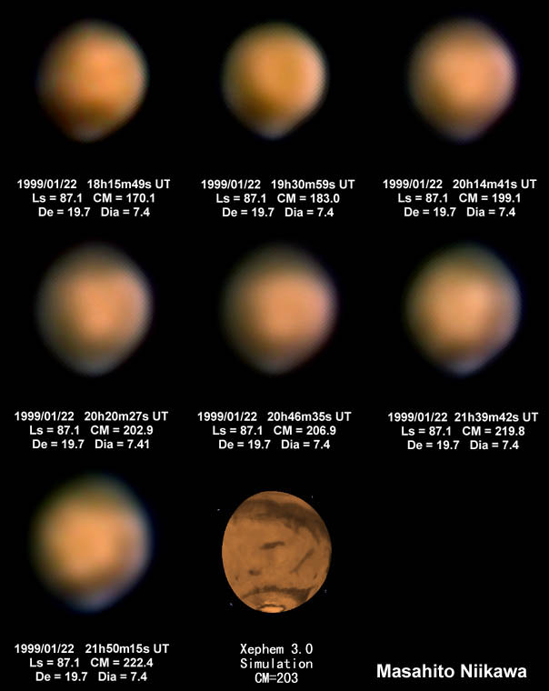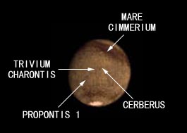 中央付近にCERBERUS(ケルベルス)とPROPONTIS 1 (プロポンティス1)が見られる位置に相当します。新川さんのシュミレーションにはCERBERUSが濃く描かれていますが,ここ20年ほど,CERBERUSが濃く見えたことはありません。1971年には比較的濃く見えましたが,1971年の大黄雲が発生したとき以来,姿がほとんどわからなくなりました。今年も画像を見る限り,この傾向は続いているように思います。新川さんの画像は周辺部の霧の再現が優れているようです。どの位置に何時ごろどれくらいの広がり方で見えるかをていねいに観測していただけると,よい目標になることと思います。(文責安達) |