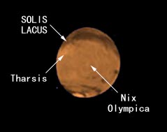 中央付近にNix Olympica(オリンピア山)が見える位置に当たります。注意深く見ると池村さんの画像の両方に中央付近に白斑が見られます。これはまさにNix Olympicaにかかった雲です。また,SOLIS LACUS(ソリス)のすぐ北に広がるTharsis(タルシス)には広い範囲に雲がかかっている様子がよく捉えられています。また,注意して見ると,20:42の画像には火星
