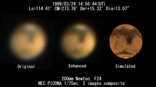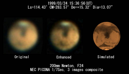 ![]() 1999/03/24 14h57m(UT) Ls =114.41゚ CM=273.78° De =+15.32゚ Dia =13.07" 20cm F8ニュートン反射(苗村鏡) テレビュー3Xバーローレンズ 合成F24 NEC PICONA 1/7秒 3枚コンポジット アンシャープマスク処理 2°プリズム 透明度 8/10 シーイング 7/10 強調画像作成:伊賀 ![]() 1999/03/24 15h37m(UT) Ls=114.43゜CM=283.57゜De=+15.32゜Dia=13.07" 20cm F8ニュートン反射(苗村鏡) テレビュー3Xバーローレンズ 合成F24 NEC PICONA 1/7秒 3枚コンポジット アンシャープマスク処理 2°プリズム 透明度 8/10 シーイング 8/10 強調画像作成:伊賀 | ||