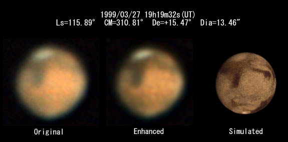 1999/03/27 19:19:32(UT) Ls=115.89゜CM=310.81゜De=+15.47゜Dia=13.46" 31cm F5 ニュートン テレビュー5Xバーローレンズ 1゜プリズム 赤外線カットフィルターDR655使用 合成 F38 NEC PICONA 1/7秒 3枚コンポジット (強調画像:作成伊賀) | ||