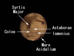 ただ,気になるのはSYRTIA MAJOR(シルチス)の北側です。SYRTISのすぐ北西に小さな斑点があります。北側の斑点がColoe (コロー)で,南側のものがAstaborae(アスタボラエ)です。この小さな斑点は気流がよほどよくないと確認することは難しいのですが,よく写っていると思います。 それなのに,この画像にはISMENIUS(イスメニウス)が写っていません。また,あるはずの位置を注意深く見ると,黄色く明るく写っています。どうやら部分的に黄雲が存在するようです。3月23日と3月24日の画像にはこれは写っていませんでした。シーイングがよくないと,追跡は難しいかもしれませんが,できれば追いかけられないかと思います。おそらくMARE ACIDALIUM(アキダリウム)の方向に移動するのではないかと考えられますので,いましばらくがんばっていただきたいと思います。 | ||