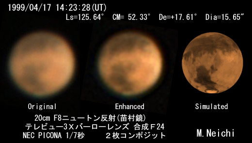 ![]() 1999/04/17 14:23:28(UT) Ls=125.64゜ CM= 52.33゜ De=+17.61゜ Dia=15.65" 20cm F8ニュートン反射(苗村鏡) テレビュー3Xバーローレンズ 合成F24 NEC PICONA 1/7秒 2枚コンポジット アンシャープマスク処理 2°プリズム 透明度 9/10 シーイング 8/10 強調画像作成:伊賀 (こちらで拡大した画像としました) | ||