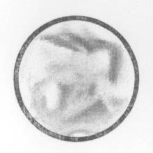 かろうじて北極冠は存在しているようです。予報からはまだ1週間以上早いのですが,急速に見えにくくなっていくのが肉眼ではよくわかります。あいかわらず,Elisium(エリシウム)が明るくよく目立っています。また,そのすぐ西側のAethria (アエテリア),東側のPropontis 1(プロポンティス1)からPropontis 2(プロポンティス2)の暗部がよく目立っています。 また,今回Utopia(ウートピア)の三角形の突起が非常によく目につきますが,ここから東側に向かって幅の広い暗部が東の方にゆるく北に傾斜しながら伸びているのが目立っています。 | ||