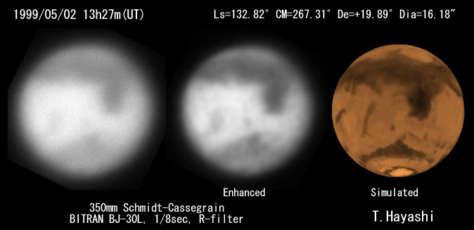 1999/05/02 13h27m(UT) Ls=132.82゜ CM=267.31゜ De=+19.89゜ Dia=16.18" 350mm Schmidt-Cassegrain BITRAN BJ-30L Cooled CCD Camera R-filter, 1/8sec, Single image | |||