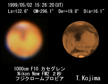 ![]() 1999/5/2 15:26:20(UT) Ls=132.6° CM=296.1° De=+19.8° Dia=16.1" 1000cm F10 カセグレン(かわべ天文公園) Nikon New FM2 2秒 フジクロームプロビア