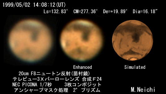 ![]() 1999/05/02 14:08:12(UT) Ls=132.83゜ CM=277.36゜ De=+19.89゜ Dia=16.18" 20cm F8ニュートン反射(苗村鏡) テレビュー3Xバーローレンズ 合成F24 NEC PICONA 1/7秒 3枚コンポジット アンシャープマスク処理 2°プリズム 透明度 8/10 シーイング 8/10 強調画像作成:伊賀 (こちらで拡大した画像としました) | |||