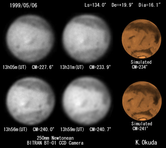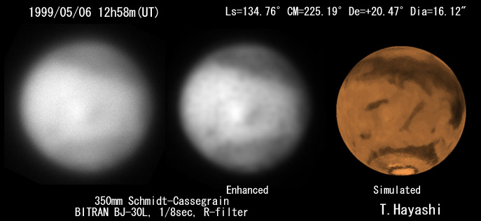 1999/05/06 12h58m(UT) Ls=134.76゜ CM=225.19゜ De=+20.47゜ Dia=16.12" 350mm Schmidt-Cassegrain BITRAN BJ-30L Cooled CCD Camera R-filter, 1/8sec, Single image | |||