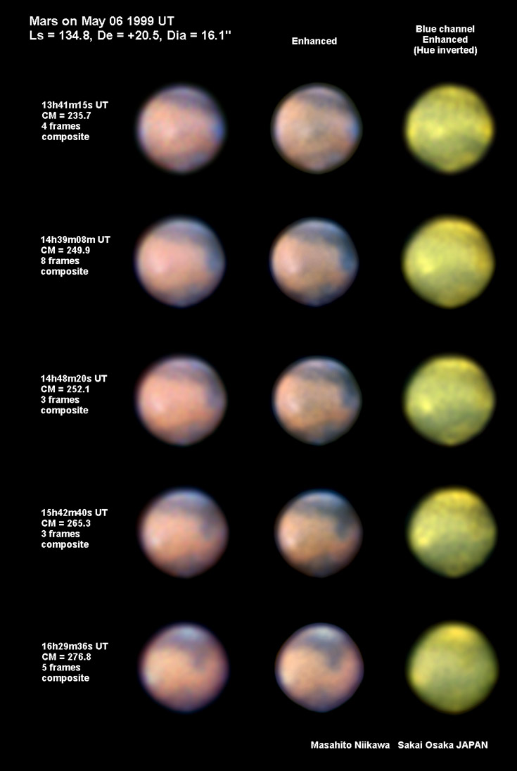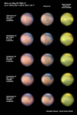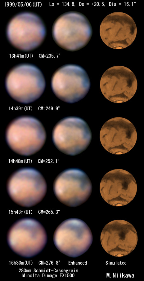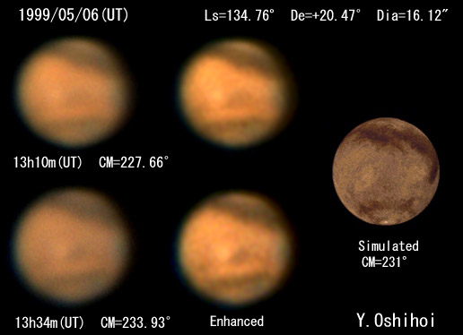 ![]() 1999/05/06 13h10m(UT) 4 images composite Ls=134.76゜ CM=227.66゜ 13h34m(UT) 3 images composite Ls=134.76゜ CM=233.93゜ Ds=+20.47゜ Dia=16.12" 210mm F5 Newtonian Digital Camera NEC Picona 1/7" 強調画像作成:伊賀