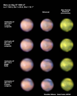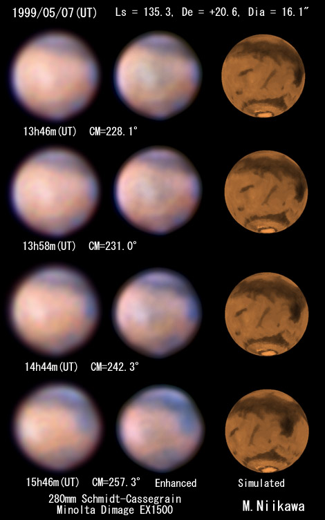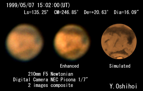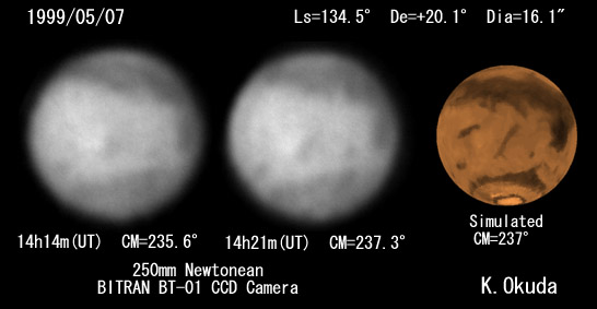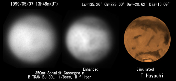 1999/05/07 13h48m(UT) Ls=135.26゜ CM=228.60゜ De=+20.62゜ Dia=16.09" 350mm Schmidt-Cassegrain BITRAN BJ-30L Cooled CCD Camera R-filter, 1/8sec, Single image | ||