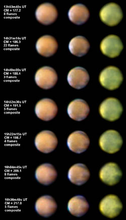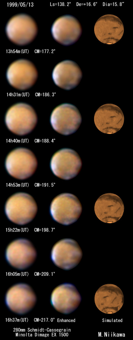 1999/05/13(UT) Ls = 138.2, De = +16.6, Dia = 15.8" 13h53m45s(UT), CM = 177.2, 8 frames composite 14h31m14s(UT), CM = 186.3, 22 frames composite 14h40m00s(UT), CM = 188.4, 3 frames composite 14h52m36s(UT), CM = 191.5, 5 frames composite 15h22m15s(UT), CM = 198.7, 4 frames composite 16h04m45s(UT), CM = 209.1, 8 frames composite 16h36m48s(UT), CM = 217.0, 5 frames composite |