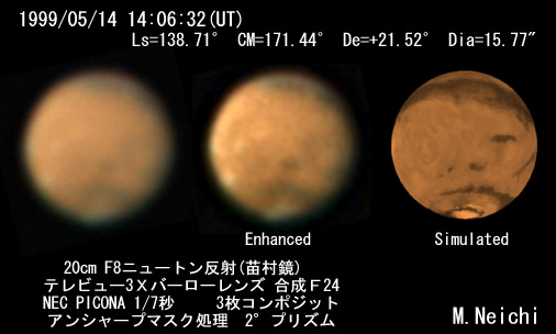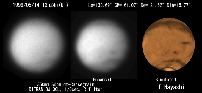 1999/05/14 13h24m(UT) Ls=138.69゜ CM=161.07゜ De=+21.52゜ Dia=15.77" 350mm Schmidt-Cassegrain BITRAN BJ-30L Cooled CCD Camera R-filter, 1/8sec, Single image | ||