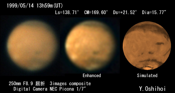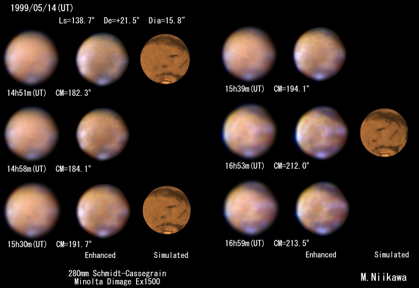 1999/05/14(UT) Ls = 138.7, De = +21.5, Dia = 15.8" 14h50m53s(UT), CM = 182.3, 9 frames composite 14h58m15s(UT), CM = 184.1, 8 frames composite 15h29m40s(UT), CM = 191.7, 6 frames composite 15h39m16s(UT), CM = 194.1,11 frames composite 16h52m48s(UT), CM = 212.0, 6 frames composite 16h59m10s(UT), CM = 213.5, 6 frames composite |