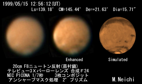 ![]() 1999/05/15 12:56:12(UT) Ls=139.18゜CM=145.44゜De=+21.63゜Dia=15.71" 20cm F8ニュートン反射(苗村鏡) テレビュー3Xバーローレンズ 合成F24 NEC PICONA 1/7秒 3枚コンポジット アンシャープマスク処理 2°プリズム 透明度 8/10 シーイング 7/10 強調画像作成:伊賀 (こちらで拡大した画像としました) | ||