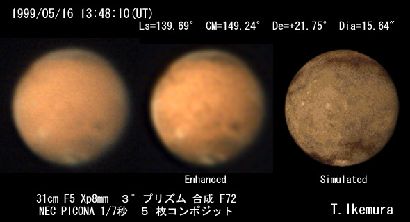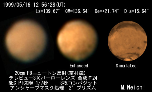 ![]() 1999/05/16 12:56:28(UT) Ls=139.67゜CM=136.64゜De=+21.74゜Dia=15.64" 20cm F8ニュートン反射(苗村鏡) テレビュー3Xバーローレンズ 合成F24 NEC PICONA 1/7秒 3枚コンポジット アンシャープマスク処理 2°プリズム 透明度 8/10 シーイング 7/10 強調画像作成:伊賀 (こちらで拡大した画像としました) | ||