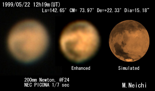 ![]() 1999/05/22 12:18:40(UT) Ls=142.65゜CM= 73.97゜De=+22.33゜Dia=15.18" 20cm F8ニュートン反射(苗村鏡) テレビュー3Xバーローレンズ 合成F24 NEC PICONA 1/7秒 3枚コンポジット アンシャープマスク処理 2°プリズム 透明度 8/10 シーイング 7/10 強調画像作成:伊賀 (こちらで拡大した画像としました) | ||