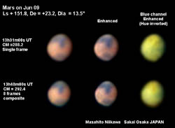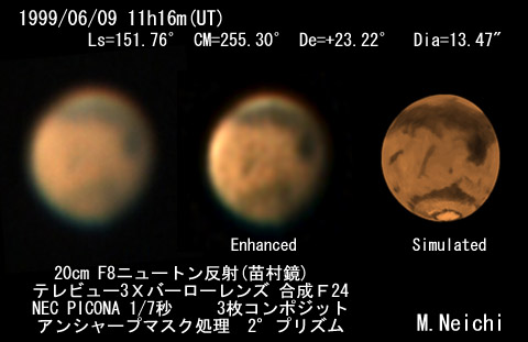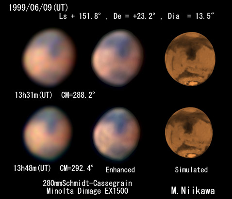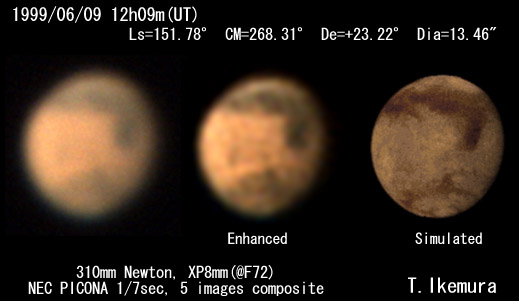 1999/06/09(UT) Ls + 151.8, De = +23.2, Dia = 13.5" 13h31m00s(UT), CM = 288.2, single frame 13h48m00s(UT), CM = 292.4, 8 frames composite |
