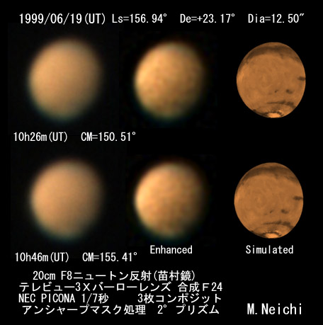 ![]() 1999/06/19(UT) Ls=156.94゜ De=+23.17゜ Dia=12.50" 10h25m(UT) CM=150.51゜ 10h46m(UT) CM=155.41゜ 20cm F8ニュートン反射(苗村鏡) テレビュー3Xバーローレンズ 合成F24 NEC PICONA 1/7秒 3枚コンポジット アンシャープマスク処理 2°プリズム 透明度 7/10 シーイング 7/10 強調画像作成:伊賀 (こちらで拡大した画像としました) | ||