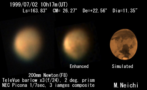 ![]() 1999/07/02 10:16:36(UT) Ls=163.83゜CM= 26.27゜De=+22.56゜Dia=11.35" 200mm Newton(F8) TeleVue barlow x3(f/24), 2 deg. prism NEC Picona 1/7sec, 3 images composite Seeing:7/10 Transp.:7/10 強調画像作成:伊賀 (こちらで拡大した画像としました) | ||