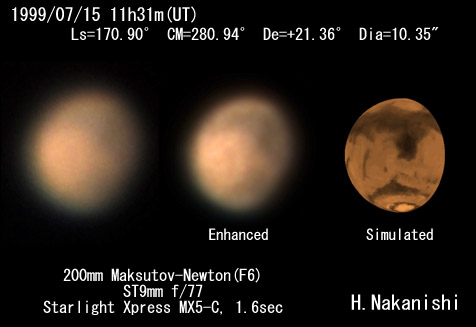 南極地方のフードは東のほうまでずいぶん広がっていることがよく分かります。特に,Eridania(エリダニア)がずいぶん明るくなっている様子が捉えられています。夕霧と一緒になって明るくなって写っているものと思われますが,全周にわたっての拡散を示唆しています。 暗色模様についてよく見ると,Syrtis(シルチス)のすぐ東に接するようにある,Moeris(モエリス)が目立って見えています。この時期になって濃くなったのか,あるいは周辺減光によるいたずらかよく分かりませんが,近年ほとんど見えなかっただけにこの写り方はいささか気になります。 | ||