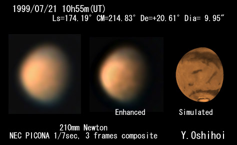 ![]() 1999/07/21 10:54:58(UT)-10:55:44(UT) Ls=174.19, CM=214.83, De=+20.61, Dia=9.95" 210mm F5 Newtonian, 3 frames composite Digital Camera NEC Picona 1/7" 強調画像作成:伊賀