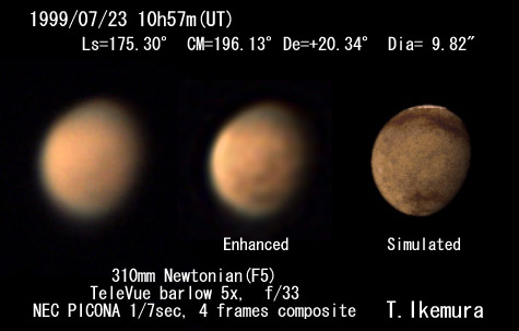 Elysium(エリシウム)の付近がやや明るく写っているところから,かなり淡くはありますが,雲はまだ存在するようです。今回,注目するところは2ヵ所あり,一つはCimmeriumu(キンメリウム)のすぐ北側に位置するAethiopis(アエチオピス)Aelis(アエリス)Zephyria(ゼフィリア)に横たわるように明るい部分ができています。この部分はもともと明るく見える部分ですが,今回は今まで以上によく目立っています。季節的な変化かダストなのかの判断はつきかねます。 また,Cebrenia(ケブレニア)の辺りも明るく見え,ダストの可能性が残されています。 | ||