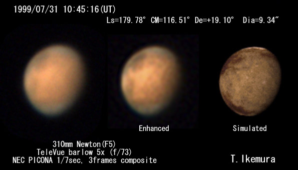南極冠周辺のフードが白っぽく見えていますが,南の端にどうやら南極冠かと思われる明るい部分が写っています。視直径が小さく,厳しい条件ながらよい画像が得られました。南極冠の一部分が見えているといってよいかと思います。注意深く見るととぎれたような見え方をしており,極点を中心に円形にできているものではないことを示しているようです。 北極地方は雲がたくさん出ており,南極地方とよく似たイメージになっています。部分的に明るさのむらが見られ,複雑な様子を示しています。 Nix Olympica(ニクス オリンピカ)とTharsis(タルシス)の3山は暗い見え方をしており,山には雲がかかっていない様子がうかがわれます。 | ||
