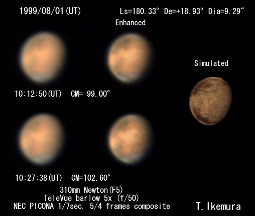 1日のことですが,前日と比べて北極地方の雲の様子が著しく変化しました。Acidarium(アキダリウム)とそのすぐ西にあるBoreumu(ボレウム)に明るい雲ができています。前日にもありましたが,今日になってずいぶん局部的に明るく成長しました。この部分はいつ見ても雲がよく発生するところのようで,今回も非常によく見られました。いままでは黄色っぽい雲の発生することが多くなってきていましたが,今回はそれとはうって変わり,白っぽい雲となりました。 Ophir(オピール)からTharsis(タルシス)にかけて明るく写っていますが,これはいつものことのように見えますが,注意して見ると,淡く雲がベールをかぶっているらしい様子が分かります。 | ||