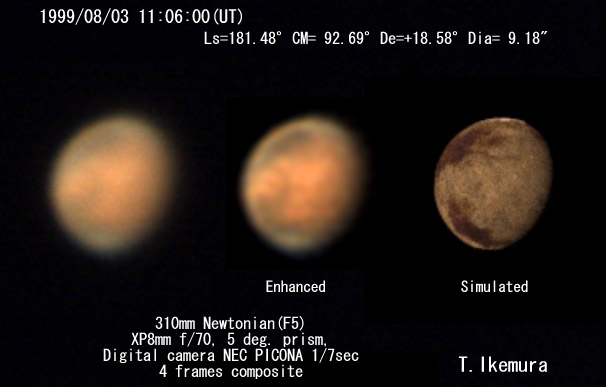 南極冠らしき見え方が一層はっきりしてきましたが,まだまだ周辺に位置しており,きれいな姿を見るにはいたりません。今回は南極地方よりも北極地方の雲のほうがよく目だっています。 今まで頻繁に雲が発生していたTempe(テンペ)の東側には目だった雲は見られませんでした。そのかわり,北極地方全域が大きくベールに覆われたように明るくなっているのが印象的でした。 模様ではGanges(ガンゲス)が全体的に見て濃くなって見えています。今までになく濃く見えており,この付近を覆っていた淡い雲が晴れたことをうかがわせています。また,Solis(ソリス)の西側に位置する,Tharusis(タルシス)3山のうちもっとも南に位置するArcti(アークティ)に明るい雲が認められるようです。 | ||