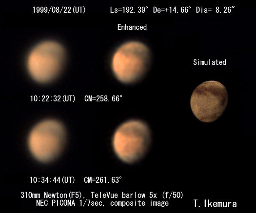 気流がよくない日の観測となりました。8月17日の観測でBoreo Syrtis(ボレオシルチス)のすぐ北側に雲が発生しているのが捉えられていますが,今回はその雲がどうやら東に大きく広がったらしい様子が捉えられています。比較して見ていただきたいと思いますが,強調画像を見るとその様子が非常によく分かります。また,その周辺にも部分的に雲の濃くなった部分ができているようですが,条件が悪くなり追跡は困難になってきました。南極冠ができはじめているこの時期にも北極地方にたくさんの雲が発生していることが明瞭に捉えられたと思います。 | ||