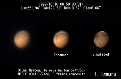 視直径がずいぶん小さくなった火星ですが,現在の特徴を良く示しています。南極冠がもうそろそろしっかりと見えてきてもよいのですが,そこまでは確認できませんでした。しかしながら,強調画像を見るとそれらしき雰囲気が漂っています。視直径が小さいので明瞭に写らないだけで,たぶん南極冠はしっかり写っているものと思われます。ただ,明るさを考えるとモヤのようなものが被さっている可能性もあります。 赤道付近には相変わらず淡い雲が覆っている様子が良く捉えられています。この時期になると発生が少なくなるのですが,まだまだ活発なようです。今回の観測で目立つのはSolis(ソリス)が非常に濃く写っている事です。視直径のわりにずいぶん鮮明な写り方で,今年はsolisの濃い年だったといえるでしょう。また,その西にあるAetheria(アエテリア)方面が視直径のわりに暗く目立っています。この付近の高山には高い部分に雲がかからず晴れていることを示しています。したがって,Solisを含めてずいぶん広い範囲が晴れていることになるでしょう。 | ||