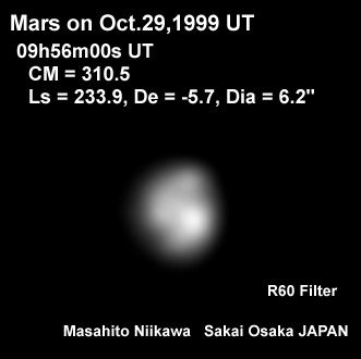 1999/10/29(UT) 09h56m00s(UT) Ls = 233.9, CM = 310.5, De = -5.7, Dia = 6.2" | ||