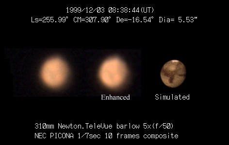 1999/12/03 08:38:44(UT) Ls=255.99 CM=307.90 De=-16.54 Dia= 5.53" 310mm Newtonian(F5) TeleVue barlow 5x f/50 3 deg. prism NEC PICONA 1/7sec,10 frames composite (強調画像:作成伊賀)
