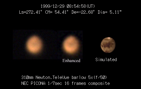 1999/12/29 08:54:58(UT) Ls=272.41 CM= 54.41 De=-22.68 Dia= 5.11" 310mm Newtonian(F5) TeleVue barlow 5x f/50 2 deg. prism NEC PICONA 1/7sec,16 frames composite (強調画像:作成伊賀)