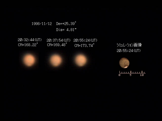 ![]() 1998/11/12 20:55:24(UT) CM=173.74゜De=+25.39゜Dia= 4.81" 31cm F5 ニュートン テレビュー5Xバーローレンズ 0.5゜プリズム 合成 F47 NEC PICONA 1/7秒 5枚コンポジット |