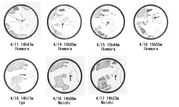 15日の池村氏の画像(15:44)にきわめてかすかながら,北緯+20°経度90°の地点に雲が認められた。また,4月16日根市氏の画像に雲が捉えられた。きわめてかすかな写り方だが,緯度は+20°N, 経度は80°位であった。ここで,雲が移動しているのではないかということに気がつき,追跡してみると4月11日の池村氏の画像から追跡できることがわかった。上に挙げた4月8日の画像にはそれらしき雲は見い出せなかった。
