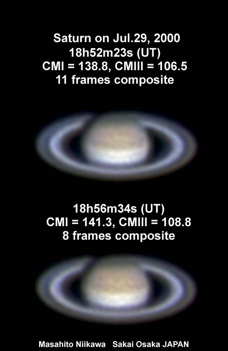 No.8 2000/07/29 18:52:23(UT) CMI = 138.8, CMIII = 106.5 11 frames composite No.9 2000/07/29 18:56:34(UT) CMI = 141.3, CMIII = 108.8 11 frames composite De = -26.5, E.Dia = 17.46" Seeing = 4/10, Transparency = 4/6