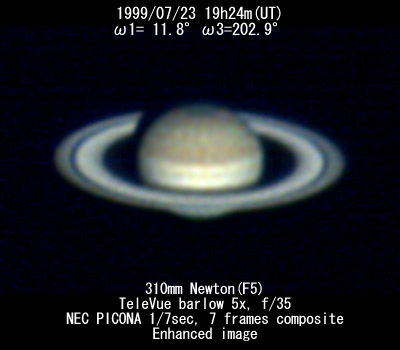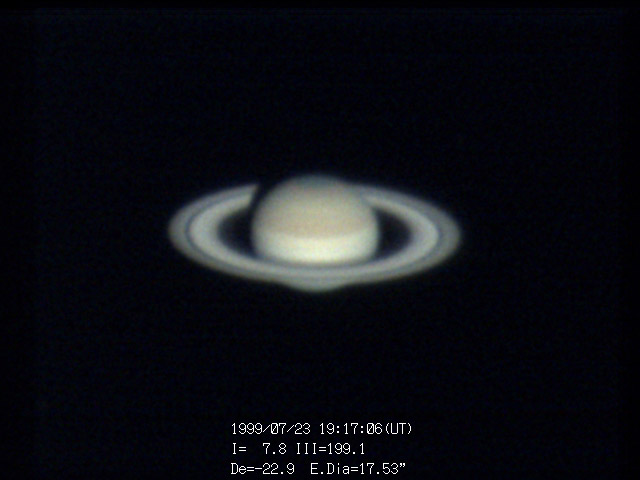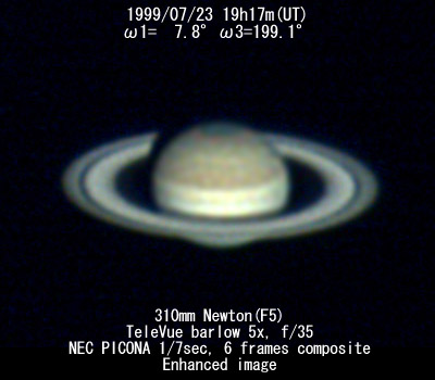 1999/07/23 19:23:50(UT) I= 11.8 III=202.9 De=-22.9 E.Dia=17.53" Ring Long Dia=39.96" Ring Short Dia=15.55" 310mm Newton(F5), TeleVue barlow x5(f/35), 2 deg. prism NEC Picona 1/7sec, 7 frames composite