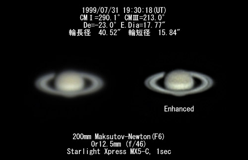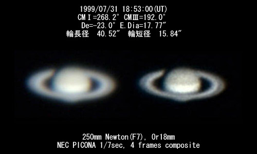 | 1999/07/31 18:53:00(UT) I=268.2 III=192.0 | 250mm Newton(F7), Or18mm NEC PICONA 1/7sec, 4 frames composite Enhanced by T.Usude | |