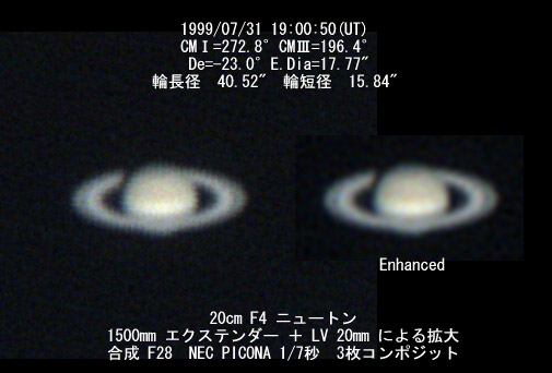 | 1999/07/31 19:00:50(UT) I=272.8 III=196.4 | 200mm Newton(F4), LV20mm (f/28) NEC PICONA 1/7sec, 3 frames composite Enhanced by Y.Iga | |