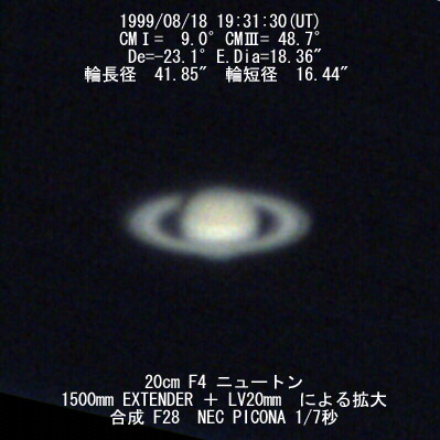 | 1999/08/18 18:22:00(UT) I=328.2 III= 9.6 De=-23.1゜E.Dia=18.36" 輪長径 41.85" 輪短径 16.44" | 200mm Maksutov-Newton(F6), Or12.5mm (f/50) Stalight Xpress MX5-C, 1.0sec Enhanced by H.Nakanishi | |