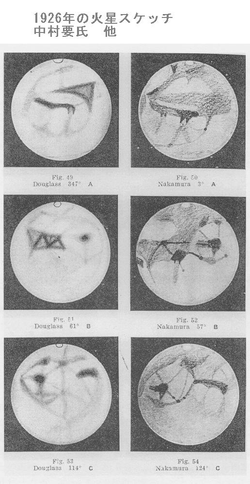 1926年の火星スケッチ ("Report on Mars no.43",W.H.Pickering, Popular Astronomy,vol.37,560,1929) 「日本で観測された火星」『天界』第117号96頁 中村要と反射望遠鏡(富田良雄・久保田諄 著)97頁