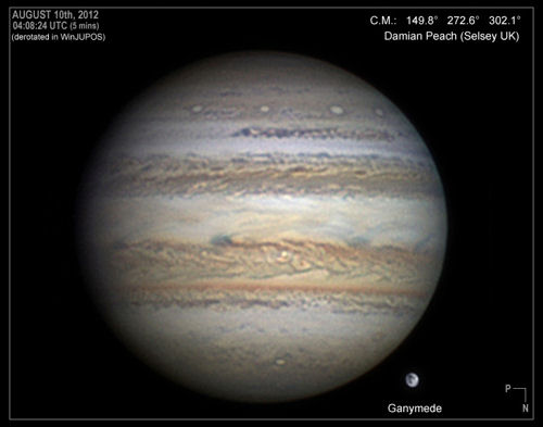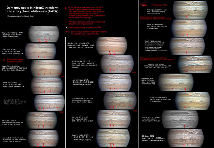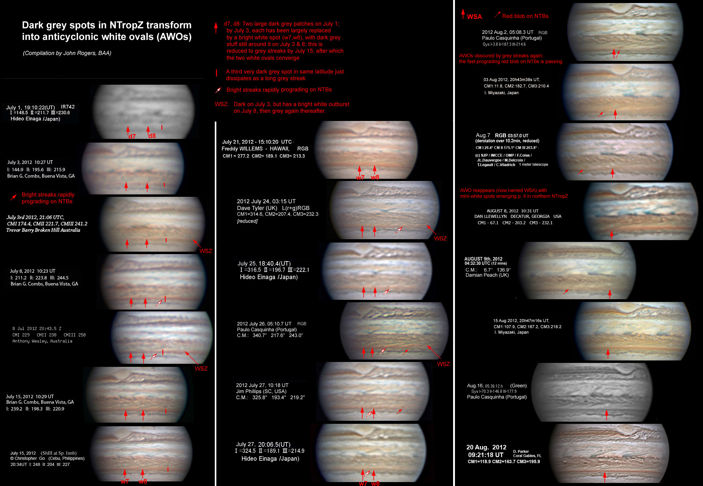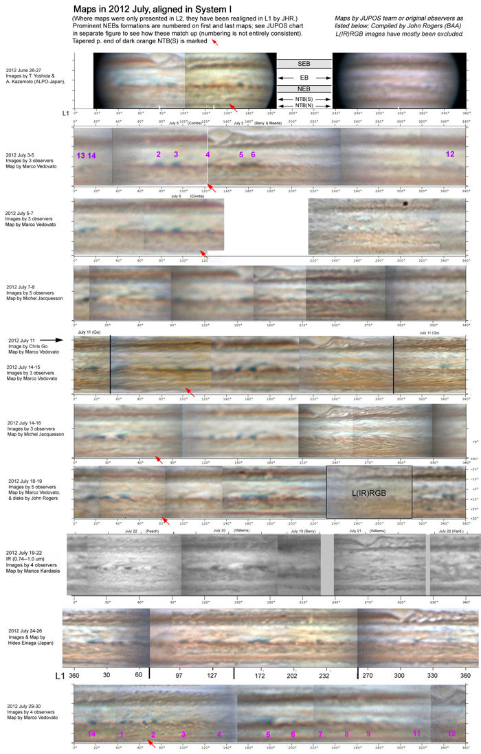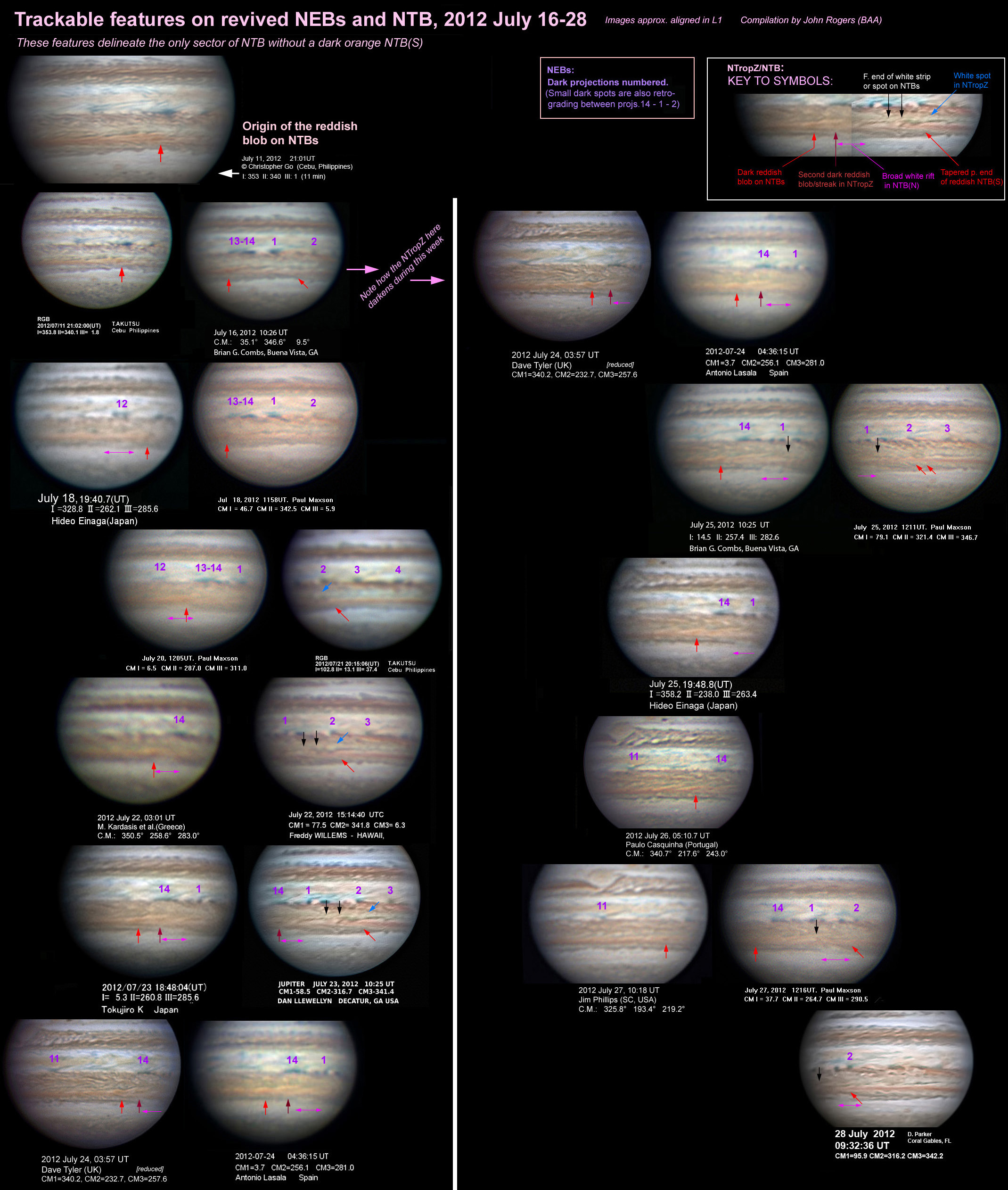 2012年、木星は隣接したドメインに起こった、NEBとNTBの復活からなる、2つ同時の大アウトブレーク(outbreak)という前代未聞の光景を示している。両方のoutbreakは太陽との合の直前に始まり、その見えない期間にほとんど発達したが、6月に木星が再び現れた時に劇的な攪乱(disturbance)は明らかであった【文献1】。現在、木星が高く昇るにつれて良くなった画像によって、またJUPOSチームからのチャートやマップによって、何が起こっているかを示す鮮明な画像を得ている。このレポートは7月と8月上旬をカバーする。執筆時点では、8月下旬で攪乱領域は落ち着いているように見える。だから、さらに結果が出るかもしれないけれども、これが現代では先例のない攪乱の主要なレポートになるだろう。