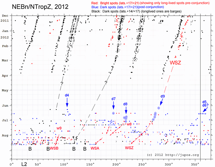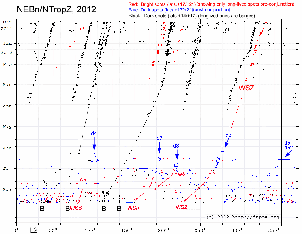 From late July onwards, the JUPOS chart for mid-NEB does show a pair of bright streaks that were moving with DL1 = +4.1 deg/day (DL2 = -3.6 deg/day) , but in a different longitude sector.