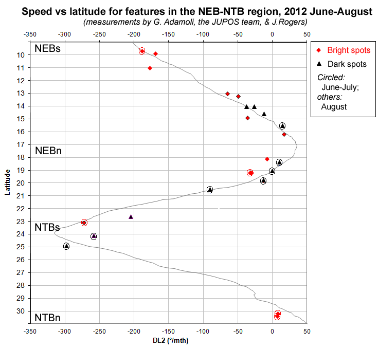初期画像の低分解能と領域の複雑さから、この変動内部のドリフトを決定することは難しいが、7月から8月に目に見えて識別された模様の追跡によって、探査機からの帯状風プロファイルにとても一致する、NEBとNTropZに渡る速度勾配を示す[図9]。2007年のoutbreakの後にカオスであることを発見した、NTBsジェット気流ピークの歪みがあるかもしれない。また、Grischa Hahn氏(私信)は、7月15日のペア画像を用いて、WinJUPOSのマップ相関解析によって帯状風プロファイルを導き出した。結果に必然的な不正確さがあるけれども、NEBからNTropZの帯状風プロファイルは変化していないことが確認された。