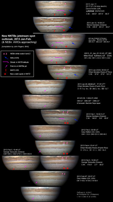 Hello all, The attached set of images shows three notable developments on Jupiter, which all deserve close attention in the next week or two. 1) NNTBs jet-stream activity resumes: Since the NTB upheaval started last April, the whole N.N.Temp. domain has been virtually white and the usual NNTBs jet-stream spots have been absent. On Feb.7, Gary Walker took a fine image on which Manos Kardasis pointed out: “NNTB dark spots have shown up. Is it a sign that will lead to a NNTB darkening?”